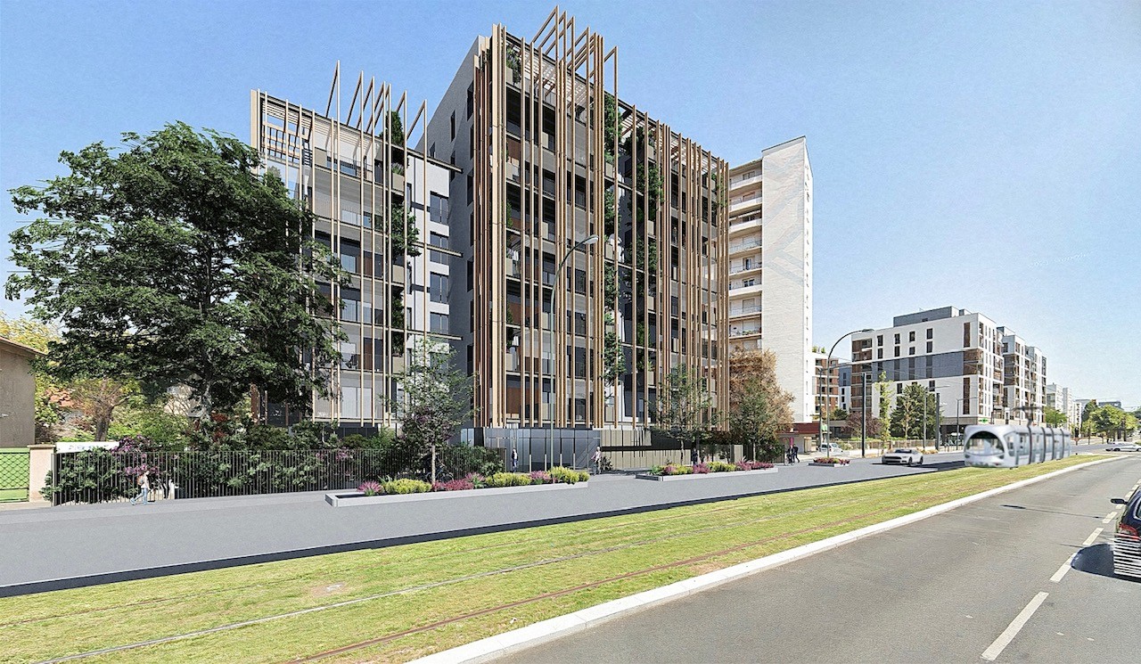 Une double peau constituée d’épines bois verticales et de stores toiles extérieurs, vient créer un espace « tampon » entre la rue et le logement ; elle offre à la fois une protection solaire, une protection acoustique et une intimisation des logements et de leurs espaces extérieurs sur une avenue particulièrement passante.