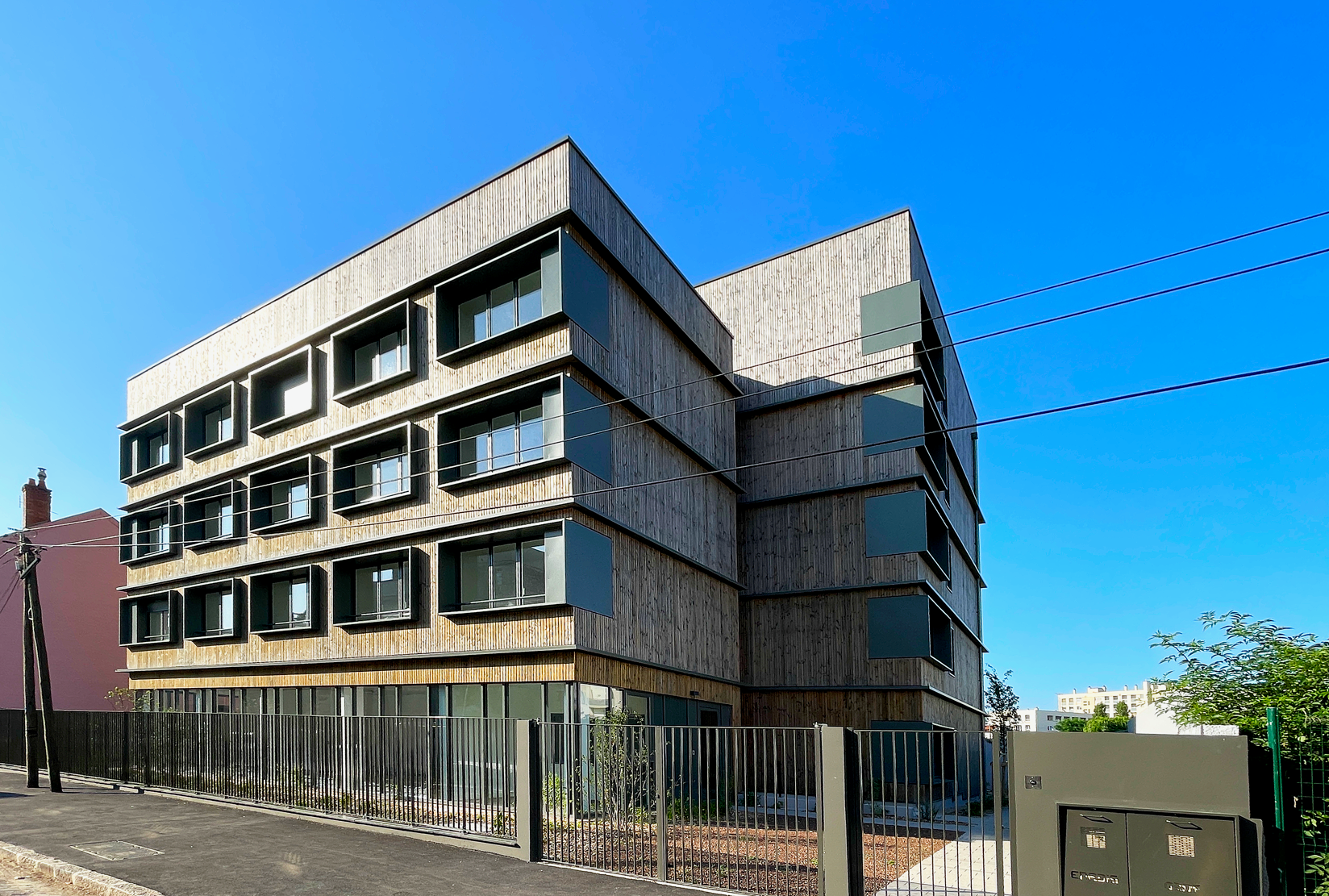 Son bardage composite à claire-voie apporte durabilité et chaleur au projet, et rythme sa façade. Un soin particulier a été apporté à la salle de travail, qui se prolonge à l’extérieur et qui forme un cadre arboré et calme. En front de rue, la plantation d’arbres crée une barrière végétale et visuelle pour le confort des résidents.